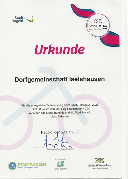 Etwa ein Dutzend Mitglieder der Iselshauser Dorfgemeinschaft „schwärmten“ kürzlich aus, um den Bienengarten des Nagolder Bezirksimkervereins in Mindersbach zu besuchen. Auf dem dortigen Gelände gab es einiges zu bestaunen. Unter anderem waren eine ganze Reihe Bienenstöcke mit jungen Bienenvölkern aufgestellt. Es gab aber auch ein sogenanntes „Insektenhotel“ und etliche Schautafeln, die über die faszinierende Welt der Bienen informierten. ... Mehr… Weniger…Urkunde für erfolgreiche Teamleistung beim STADTRADELN 2023