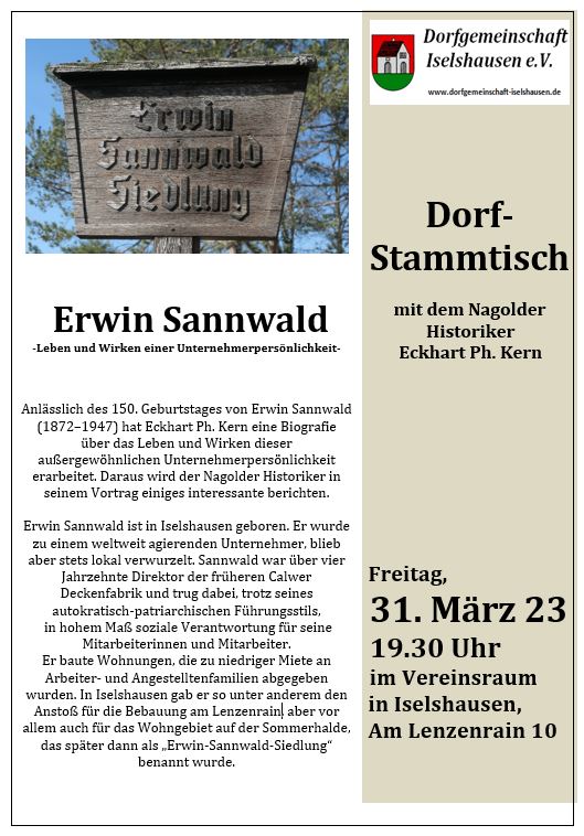 Beim Iselshauser Dorf-Stammtisch ging es diesmal um Erwin Sannwald (1872 - 1947), den langjährigen Direktor der Calwer Deckenfabrik, dessen Geburtstag sich im vergangenen November zum 150. Mal jährte. Anlässlich dieses Jubiläums hatte der Nagolder Historiker Eckhart Kern ...